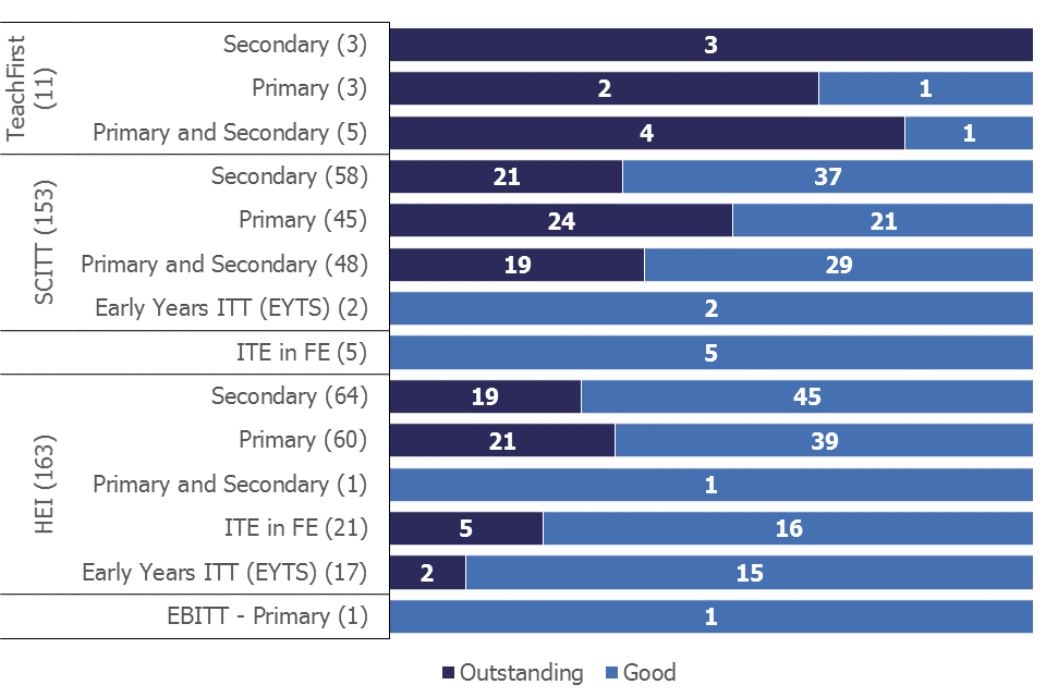 Where ‘provision is repeatedly of requires improvement or lower quality’, the Department for Education will often withdraw trainee allocations until the age phase partnership has been judged to be good or outstanding. As a result, some partnerships close all or part of their provision when judged to be less than good. This is one reason why inspection outcomes are so high: weaker providers or partnerships often close, and closed providers are not included in the statistics on the outcomes for all open providers at their most recent inspection.