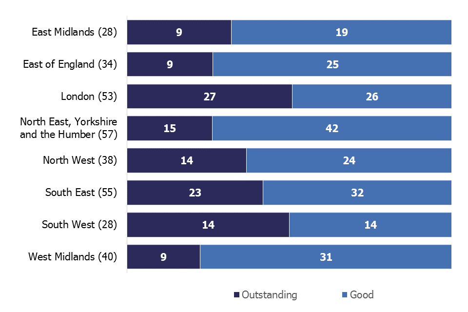 Around a quarter of age phase partnerships in the West Midlands, East of England and North East, Yorkshire and the Humber regions are outstanding compared to around half of age phase partnerships in the South West and London regions.
