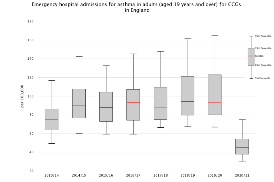 This update shows there has been a significant drop in emergency hospital admissions for respiratory disease from 1,592 per 100,000 population in the financial year ending 2020 to 711 per 100,000 population in the financial year ending 2021. From 2013/14 to 2019/20 the rate of respiratory disease admissions had been increasing.
