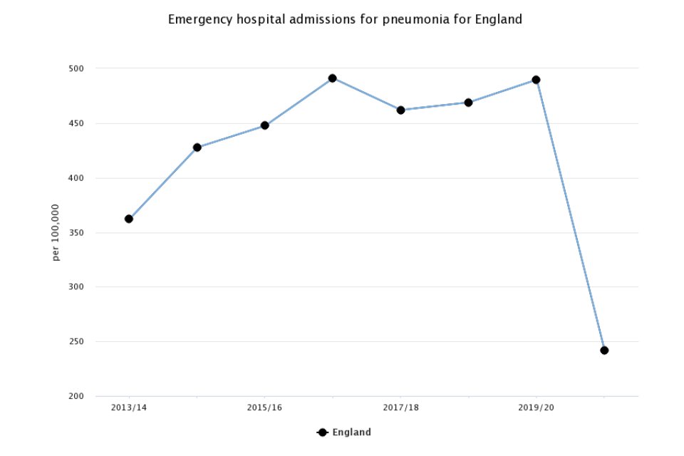 There has been a significant drop in emergency hospital admissions for pneumonia from 489.7 per 100,000 population in the financial year ending 2020 to 241.7 per 100,000 population in the financial year ending 2021. A significant drop was observed in all CCGs.