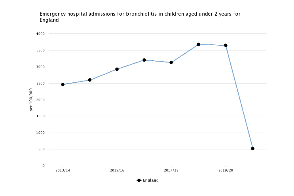 In England, the rate of emergency hospital admissions for bronchiolitis in children under 2 years dropped from 3,645 (3,612 to 3,678) per 100,000 population in the financial year ending 2020 to 518 (506 to 531) per 100,000 population in the financial year ending 2021. In the financial year ending 2020 there were 47,506 admissions, in the financial year ending 2021 there were only 6,633 admissions.