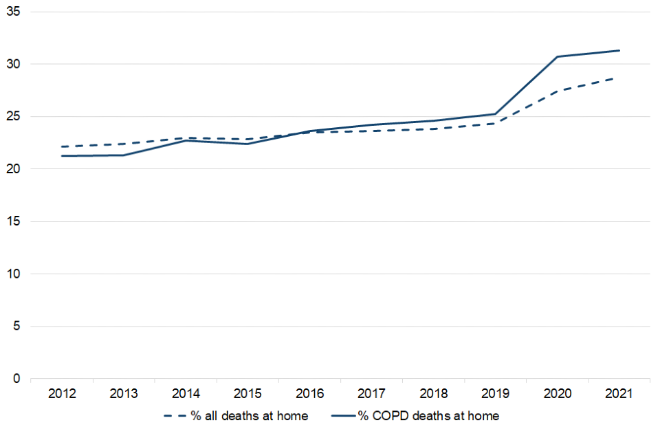 The percentage of deaths from all causes which occurred at home increased rapidly between 2019 to 2021 but this increase was greater for COPD. In 2019 there was a difference of 0.8% between the percentage of COPD deaths occurring at home (25.2%) and deaths from all causes occurring at home (24.4%). This difference had increased to 3.3% in 2020 and was 2.6% in 2021.