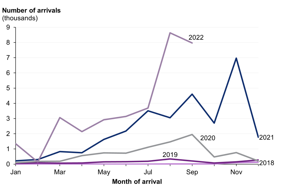 The month of August 2022, saw the highest number of small boat arrivals of any month since data has been collected (8,631), with a similar number arriving in September 2022 (7,964).