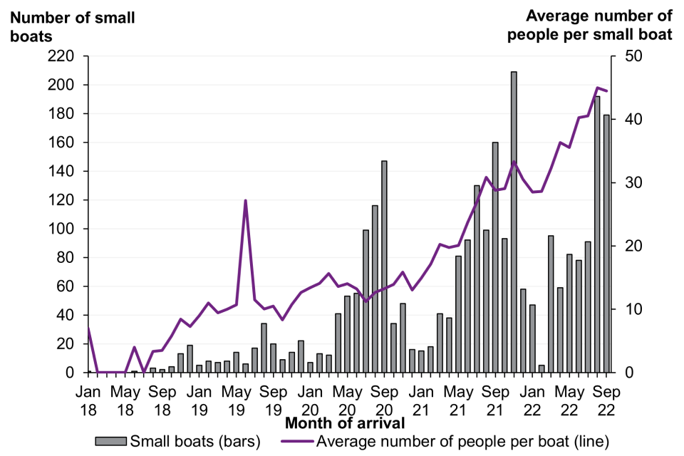 However, the increase in the number of people arriving in 2022 so far was related to both more boats making the crossing and an increase in the average number of people on each boat. In 2021, there was an average of 28 people per small boat, much higher than 2020 (13 people per small boat), 2019 (11 people) and 2018 (7 people). This trend has continued and there has been an average of 40 people per small boat in the first nine months of 2022.