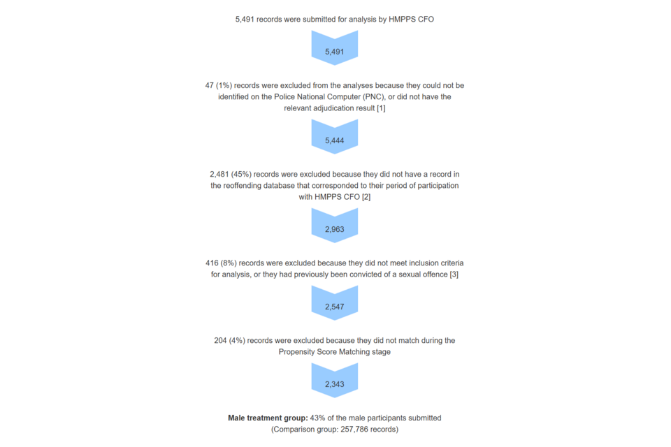 The headline analysis in this report measured proven reoffences in a one-year period for a ‘treatment group’ of 2,343 male offenders who began receiving support some time between June 2021 and July 2023, and for a much larger ‘comparison group’ of similar offenders who did not receive it. The analysis estimates the impact of receiving support from HMPPS CFO on reoffending behaviour.