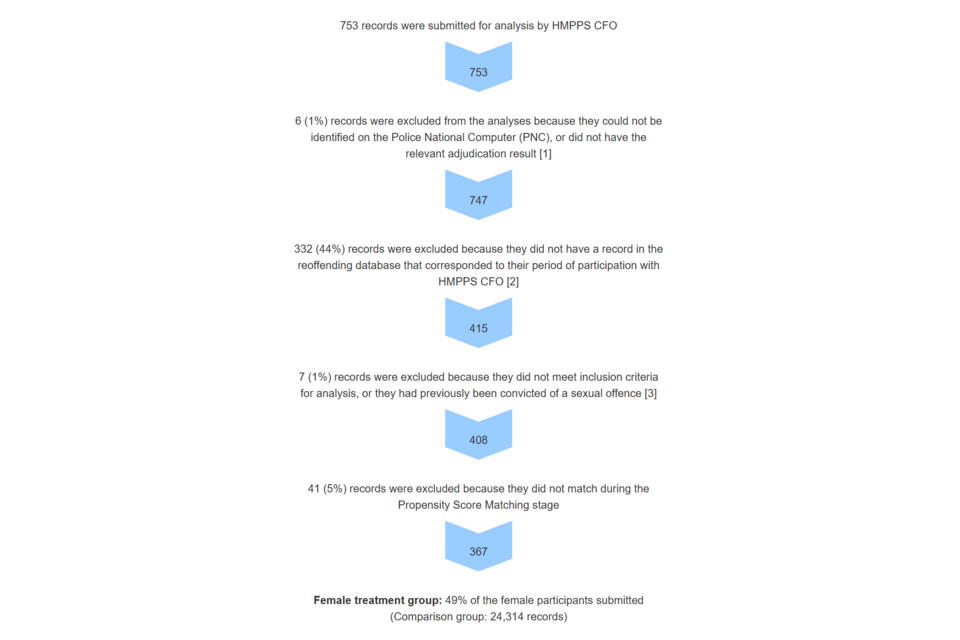 The headline analysis in this report measured proven reoffences in a one-year period for a ‘treatment group’ of 367 female offenders who began receiving support some time between June 2021 and July 2023, and for a much larger ‘comparison group’ of similar offenders who did not receive it. The analysis estimates the impact of receiving support from HMPPS CFO on reoffending behaviour.