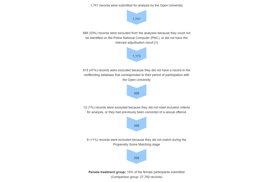The headline analysis in this report measured proven reoffences in a one-year period for a ‘treatment group’ of 338 female offenders who participated in an Open University programme some time between 1986 and 2023, and who were released from prison between 2002 and 2023, and for a much larger ‘comparison group’ of similar offenders who did not take part. The analysis estimates the impact of receiving support from The Open University on reoffending behaviour.