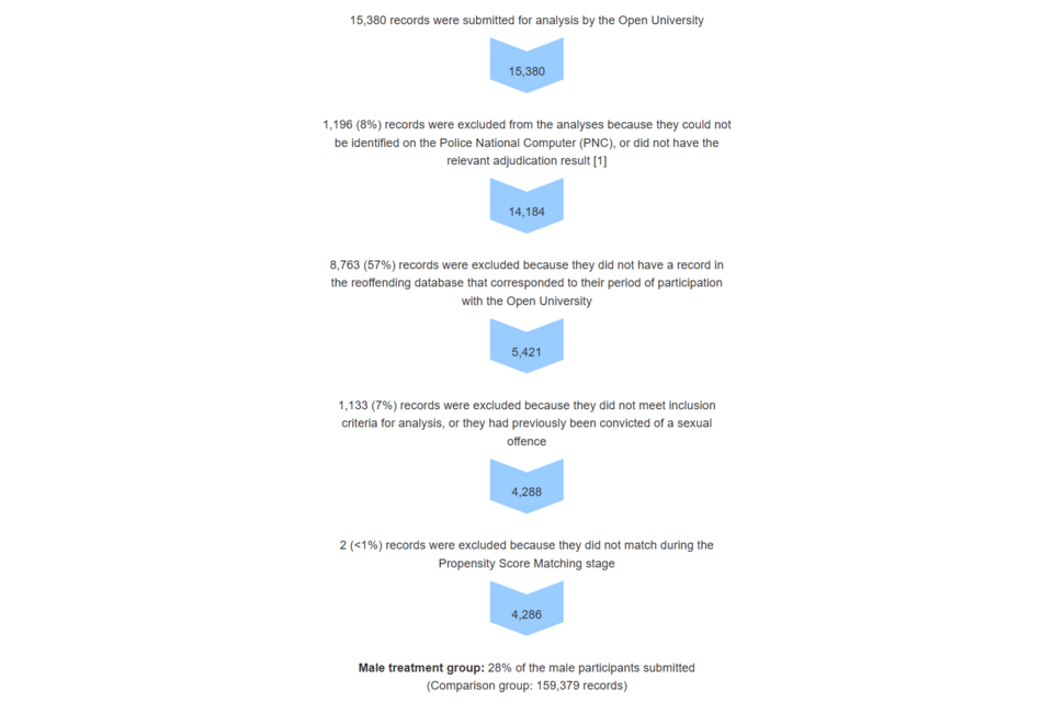 The headline analysis in this report measured proven reoffences in a one-year period for a ‘treatment group’ of 4,286 male offenders who participated in an Open University programme some time between 1986 and 2023, and who were released from prison between 2002 and 2023, and for a much larger ‘comparison group’ of similar offenders who did not take part. The analysis estimates the impact of receiving support from The Open University on reoffending behaviour.