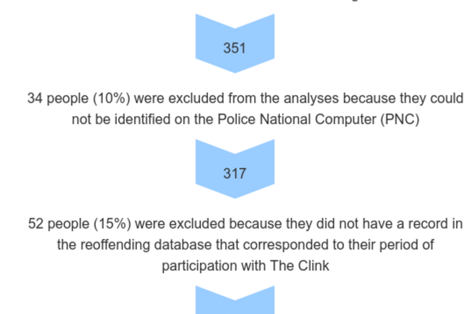 Of our presented data, 26% of our graduates were excluded from the assessment due largely, we understand, to them not being matched on the PNC database or the reoffending database. This is disappointing with 93 graduates being excluded from the 351 submitted.