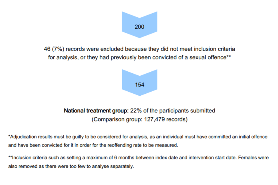 The sizes of the treatment and comparison groups for reoffending rate and frequency analyses are provided below. To create a comparison group that is as similar as possible to the treatment group, each person within the comparison group is given a weighting proportionate to how closely they match the characteristics of individuals in the treatment group. The calculated reoffending rate uses the weighted values for each person and therefore does not necessarily correspond to the unweighted figures.