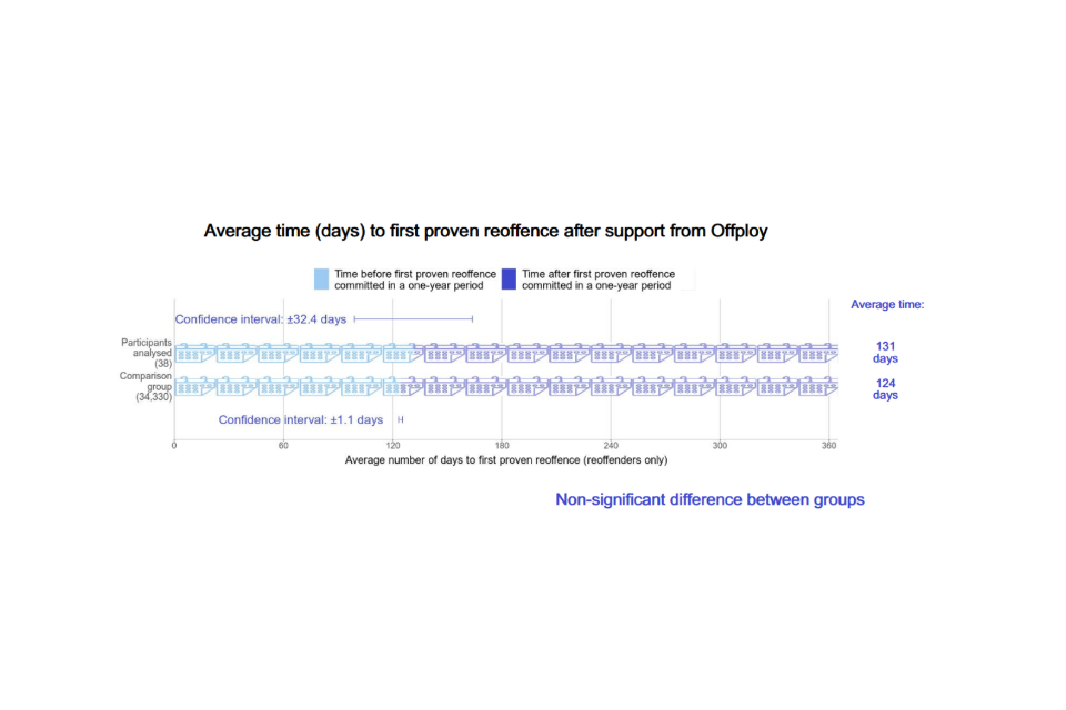 | “This analysis does not provide clear evidence on whether support from Offploy shortens or lengthens the average time to first proven reoffence. There may be a number of reasons for this and it is possible that an analysis of more participants would provide such evidence.” | |