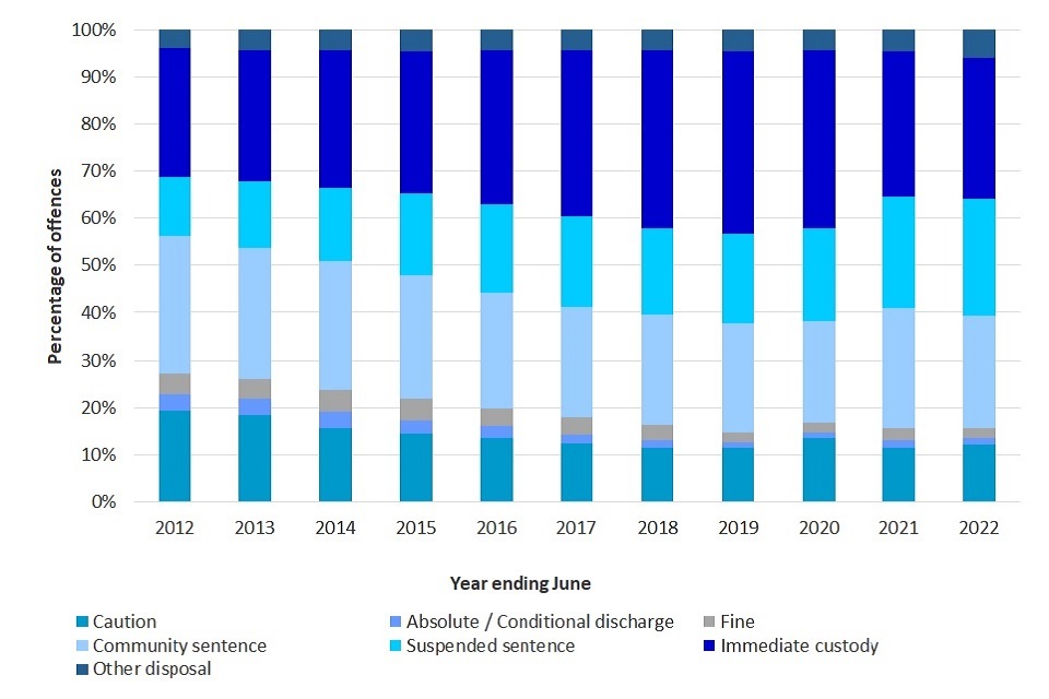 Please note, however, that year ending June 2022 has a much higher number of cases referred to the Crown Court and awaiting sentencing than previous years and the picture for this year is more subject to change when these cases receive final decisions.