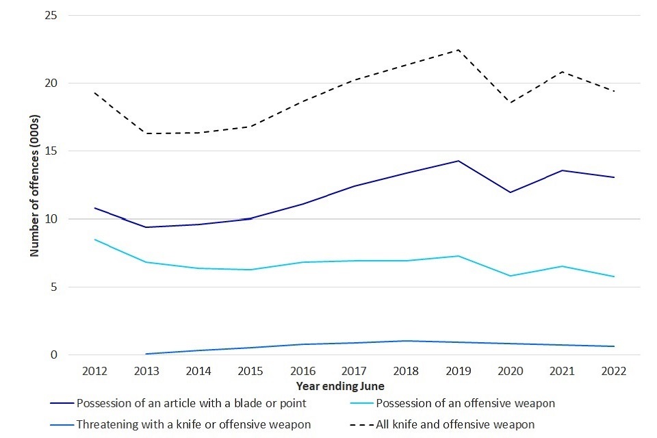 In year ending June 2022 19,448 knife and offensive weapon offences were formally dealt with by the CJS. This is a decrease of 7% since year ending June 2021, but is 5% higher than in year ending June 2020 which includes the lockdown at the very start of the pandemic.
