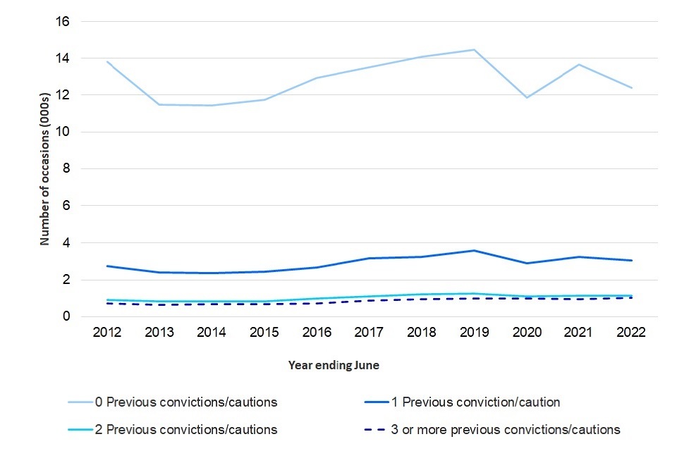 Figure 3 shows the number of cautions or convictions for a knife or offensive weapon offence, broken down by the number of previous cautions or convictions the offender had previously received for a knife or offensive weapon offence. Whilst the number of offenders with no previous knife and offensive weapon offence rose year on year between year ending June 2014 and year ending June 2019 (ending on 14,470), this made up a smaller proportion of offenders (as described above). The number of offenders with no previous knife and offensive weapon offence fell to 11,847 in year ending June 2020, when fewer cases were dealt with, before rising again. Although there was a subsequent decrease between year ending June 2021 and year ending June 2022 the number of offenders with no previous cautions or convictions for a knife or offensive weapon offence was 12,395, higher than in year ending June 2020.