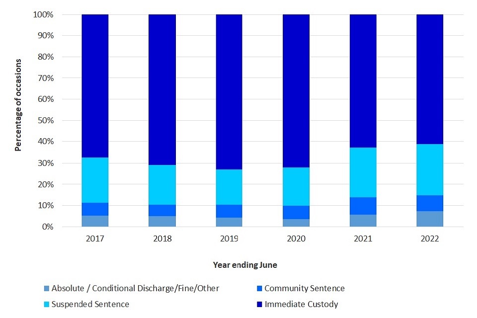 This had been stable at around 38%-39% between year ending June 2018 and year ending June 2020 but dropped between then and year ending June 2022. In this period there was a corresponding increase in the proportion of offenders receiving a suspended sentence or community sentence.