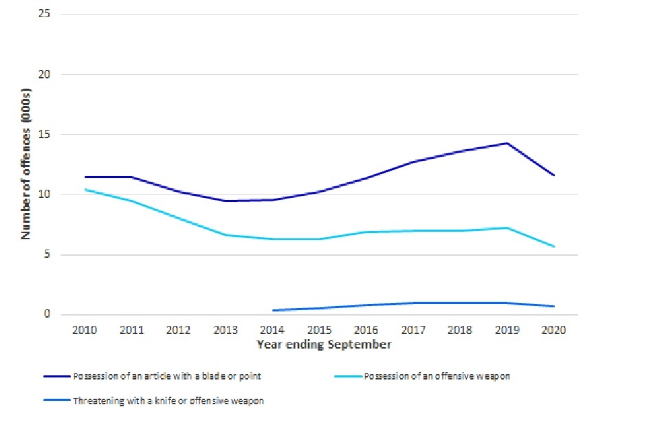 Recent police recorded crime figures showed a 5% decrease in the number of knife and offensive weapon offences recorded from 38,602 in the year ending June 2019 to 36,841 in the year ending June 2020. Furthermore, information published by the Home Office on “Crime outcomes in England and Wales” show that 50% of these offences resulted in a charge or police caution in the year ending March 2020.