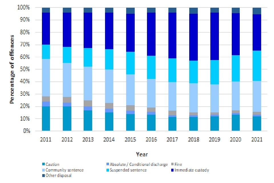 The proportion of offenders receiving an immediate custodial sentence for a knife and offensive weapon offence decreased to 29% in 2021
