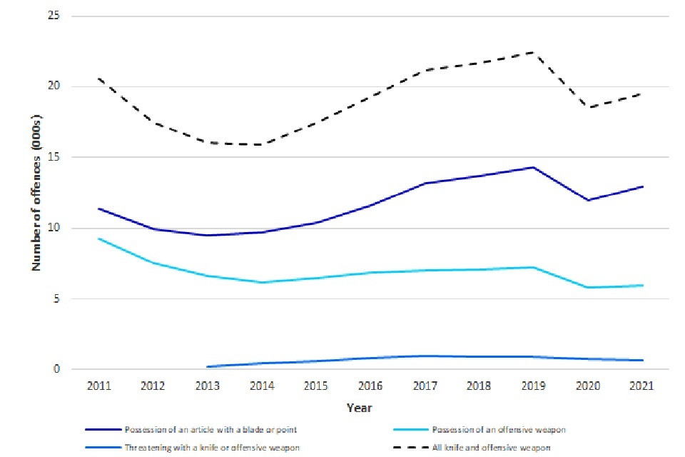 This is reflected in recent police recorded crime figures published by the ONS which showed a 7% increase in the number of knife and offensive weapon offences recorded from 36,194 in 2020 to 38,786 in 2021. Furthermore, information published by the Home Office on “Crime outcomes in England and Wales” show that 50% of these offences resulted in a charge or police caution in the year ending March 2021.
