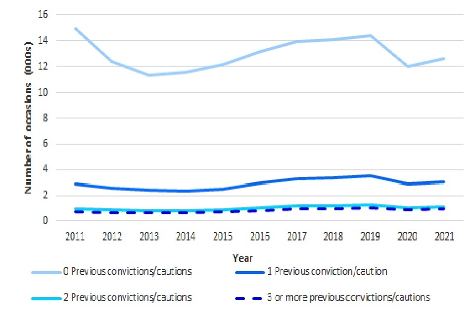 Figure 3: Number of previous cautions or convictions for the possession of a knife or offensive weapon offence for offenders cautioned or convicted for a knife or offensive weapon offence, England and Wales, annually from 2011 (Source: Interactive Pivot Table Tool)
