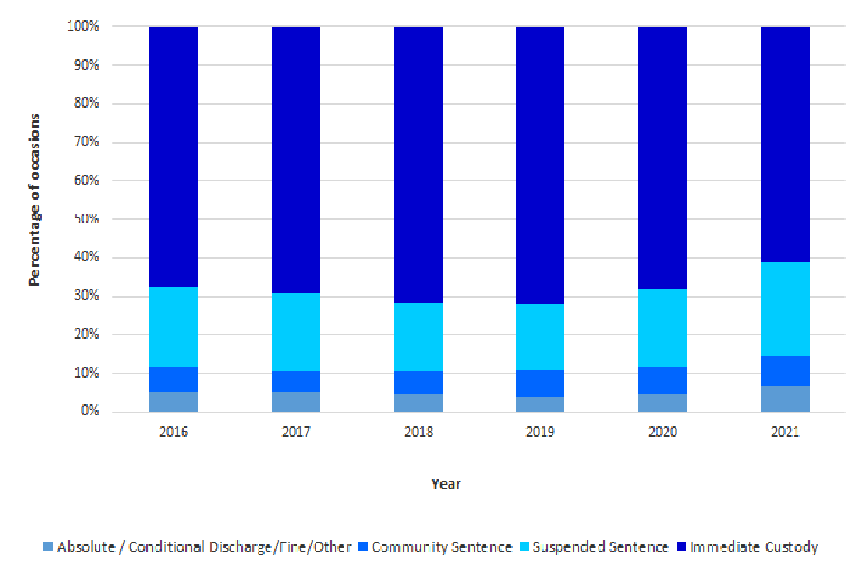 In 2021 around three fifths (61%) of adult offenders sentenced under Section 315 of the Sentencing Act 2020 received an immediate custodial sentence. This has dropped from 72% in 2019. Overall, 85% of adult offenders sentenced under Section 315 of the Sentencing Act 2020 in 2021 received some form of custodial sentence, either immediate custody or a suspended sentence.