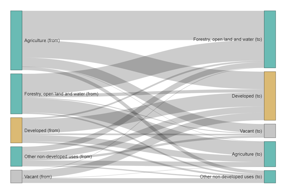 - The top three previous land use groups changing to developed use, as measured by area were: ‘Agriculture’ (33% or 26,300 hectares), ‘Other developed use’ (13% or 10,800 hectares), and ‘Industry and commerce’ (13% or 10,200 hectares). See Live Table P350 and the interactive dashboard.