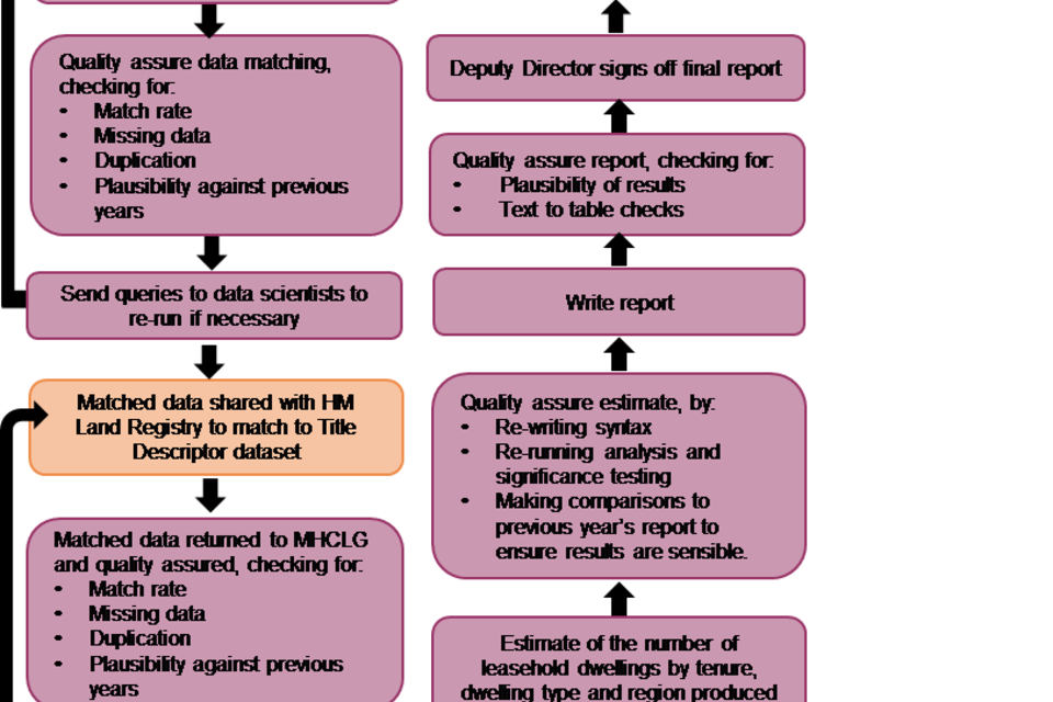 The data quality concern is low because of the robustness of the data on which the estimate is based, and the high match rate achieved between the English Housing Survey and the HM Land Registry data. A full outline of the statistical production process and quality assurance carried out is provided in the flow chart below.