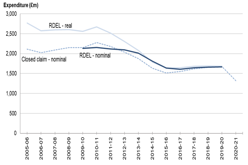 These measures show a large reduction in legal aid expenditure from around 2010-11, mostly due to changes to the scope of civil legal aid introduced by the Legal Aid, Sentencing and Punishment of Offenders (LASPO) Act from 2013-14, reductions in criminal legal aid workloads and reductions in the fees payable to legal aid providers. Figures for 2020-21 RDEL released once laid before parliament.