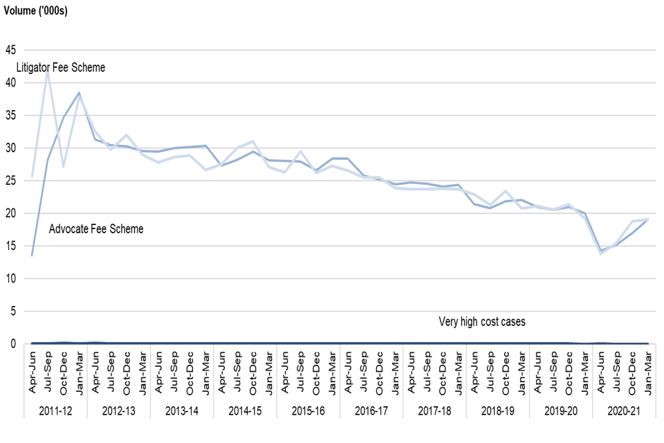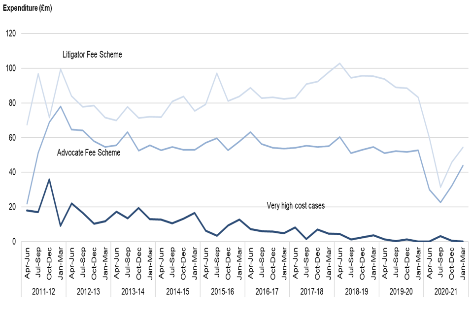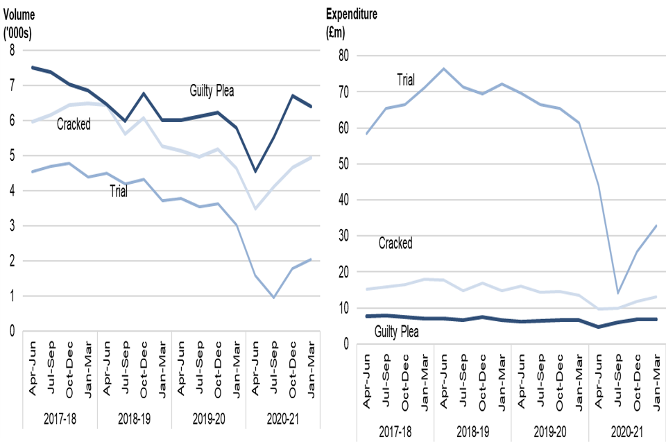 Overall Crown Court expenditure decreased this quarter; down by 28% in January to March 2021 compared with the same period of the previous year. This is driven by a falling volume in the category of completed trials within the Crown Court due to the ongoing pandemic, with completed trial expenditure in the graduated fee schemes falling by around a half over the same period.