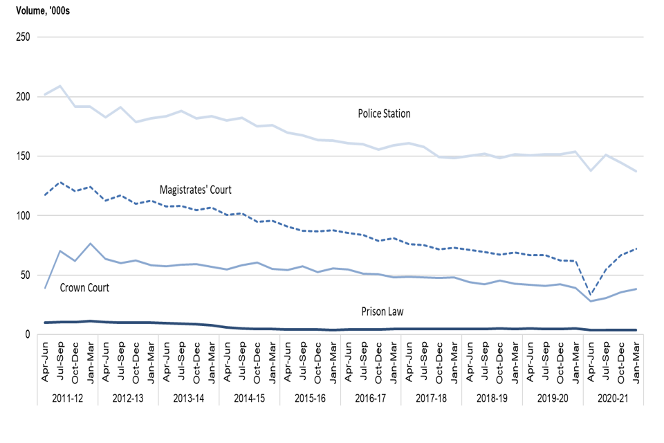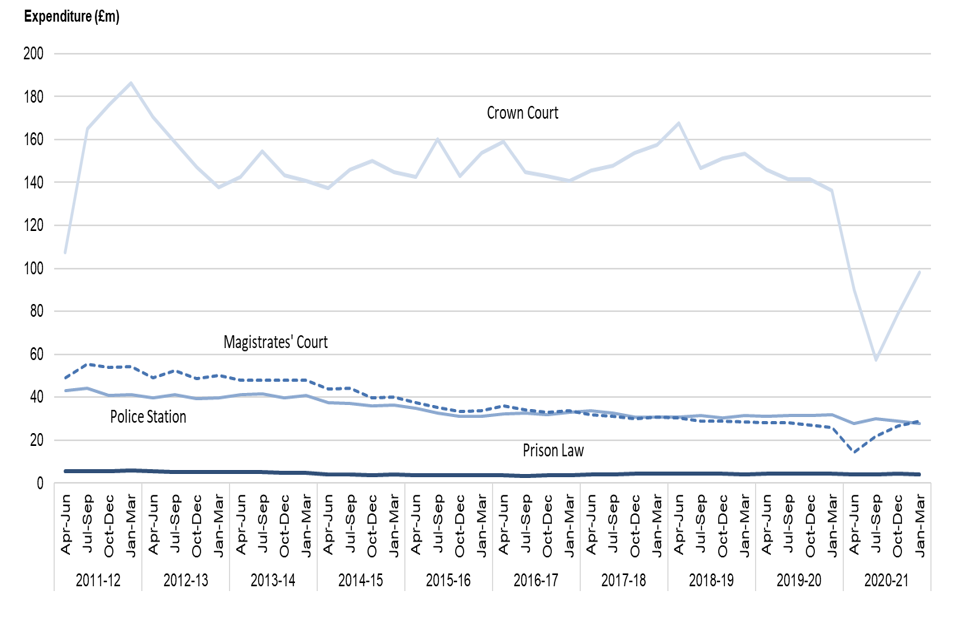 Although Crown Court work comprises a relatively small portion of criminal legal aid in terms of volume, it usually accounts for around two-thirds of all criminal legal aid expenditure. However, due to the impact on court hearings and the lack of courtroom availability for jury trials this has fallen to around a half of all criminal legal aid expenditure.