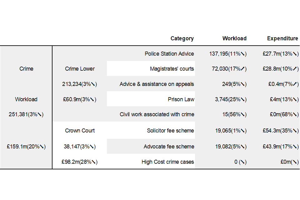 Crime Lower (covered in tables 2.1 and 2.2) includes police station advice, magistrates’ court and prison law. Table 2.1 provides the Crime Lower workload whereas table 2.2 gives the Crime Lower expenditure.