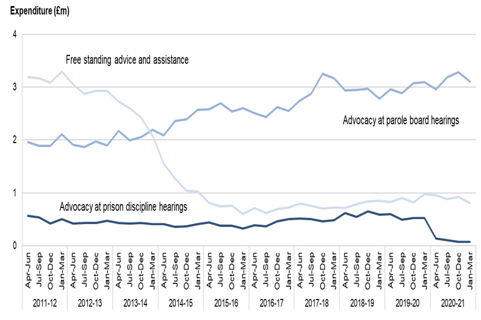 There are two reasons for this smaller increase in expenditure in comparison to the larger increase seen in volumes and both are due to more work being carried out in less complex fixed fee areas. The first, via the accelerated Criminal legal aid reforms since October 2020, cover payment for work on sending cases to the Crown Court. This new category shown in the tables accompanying this bulletin had almost 10,000 claims costing £2.2m completed this quarter and are expected to increase further. Secondly, there has been rise in the number of sessions being held via the court duty solicitor scheme. This allows a person that has already been charged with an offence to consult with and be represented by a solicitor at the magistrates’ court on their first appearance if they do not have, or have not contacted, their own solicitor.