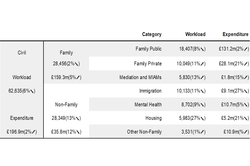 Civil legal aid volumes and expenditure show a mixed picture compared to the same quarter last year, but there are increases across some schemes overall since last quarter. Civil representation applications remain slightly lower than last year, and legal help starts and claims remain much lower than last year. Applications for civil representation domestic violence cases have seen the biggest increase since last year, however this is not reflected in the DVCA gateway which remains lower than expected. Mediation workload has increased and now exceeds levels seen previously, and HPCDS volumes are increasing, although they are still well below expected levels.