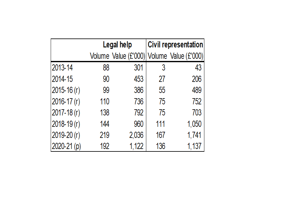 This analysis should be treated as provisional information providing a high-level estimate of legal aid volumes in April 2021. As application and starts volumes begin to return to expected levels, some or all of this section may be removed in future releases. Ongoing monitoring of volumes will continue, and management information will be published where beneficial to users.