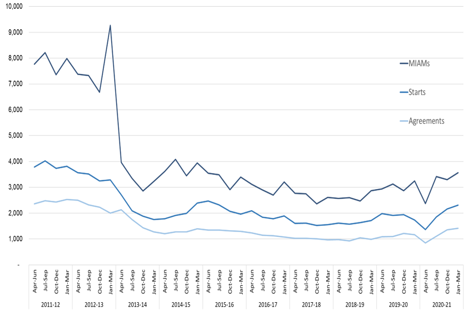 Figure 10: Family mediation assessments, starts and agreements, April to June 2011 to January to March 2021