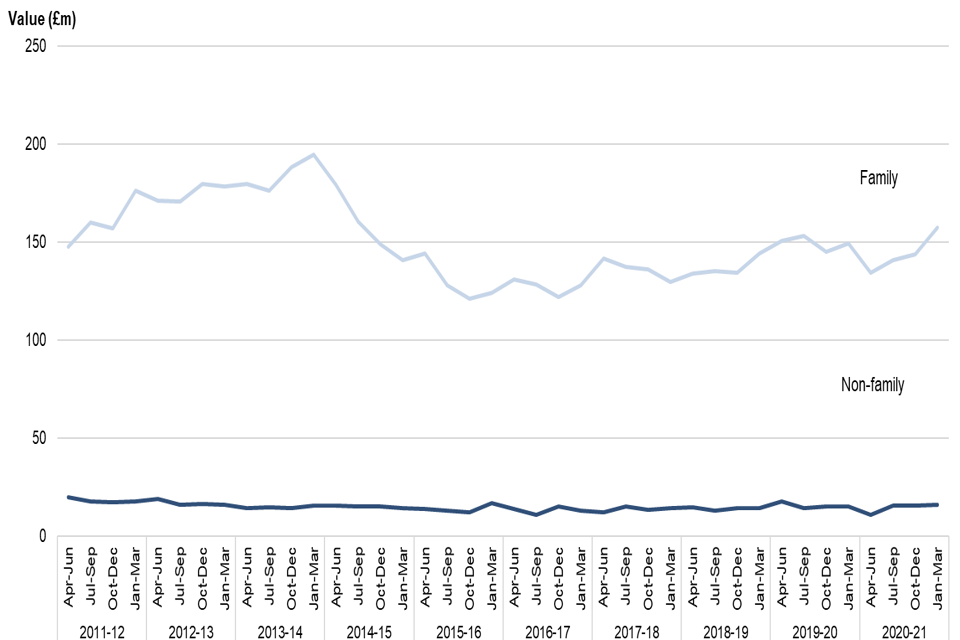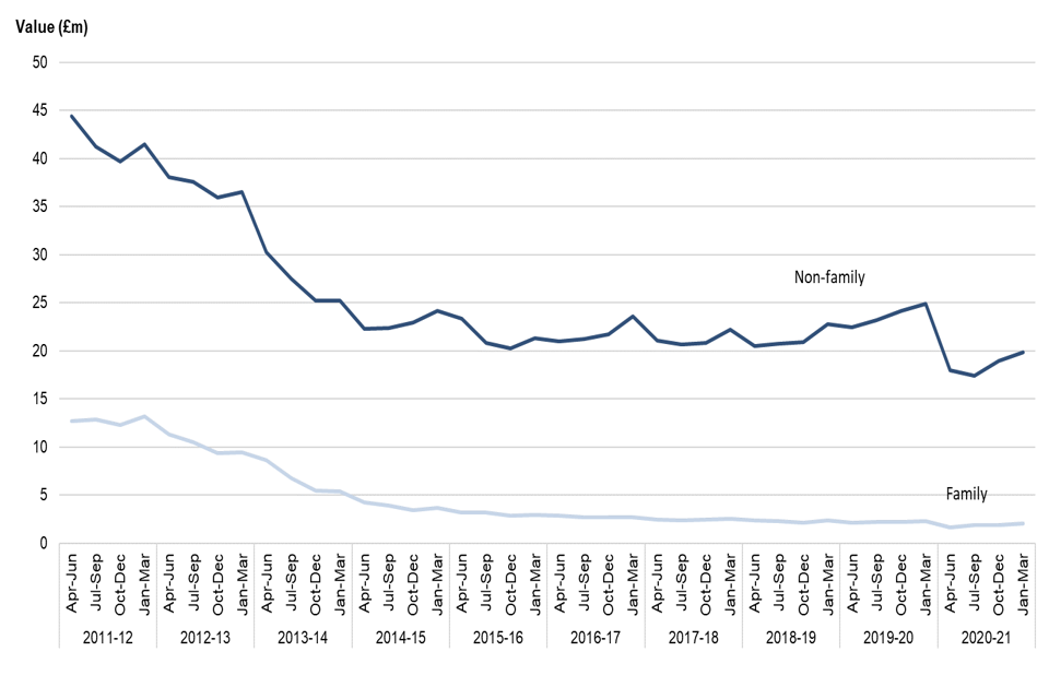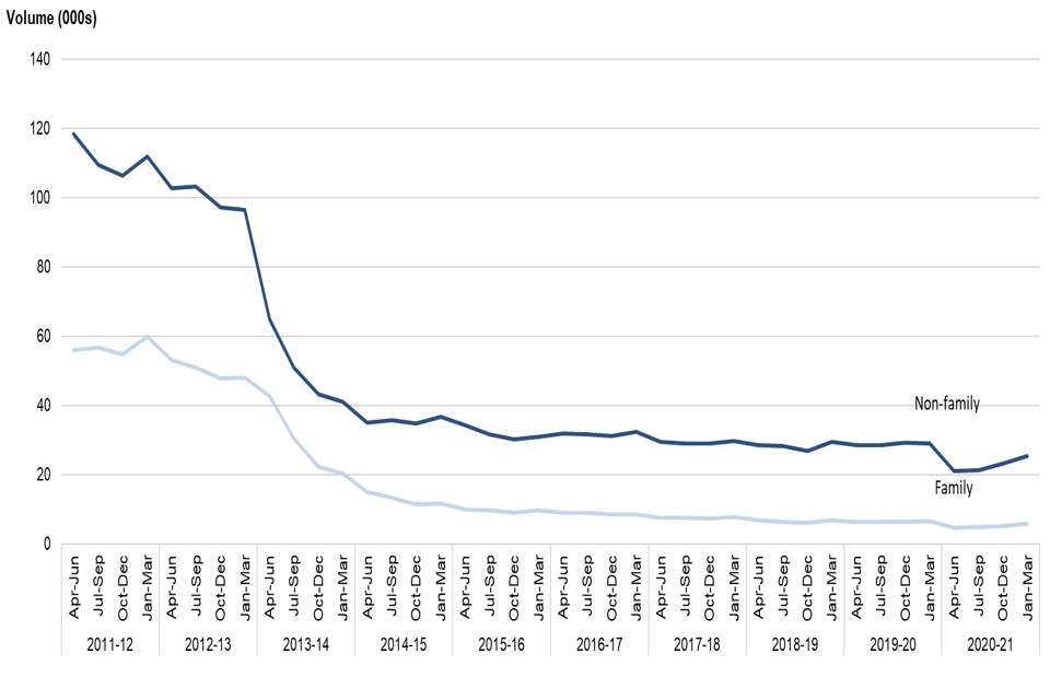 In January to March 2021 family legal help starts (covered in table 5.1) increased by 1% compared to the same quarter last year. Completed claims (covered in table 5.2) decreased by 10% and expenditure (covered in table 5.3) decreased by 11%. There was a steep decline immediately following the implementation of LASPO Act in April 2013, with a more gradual decline over the last 2 to 3 years.