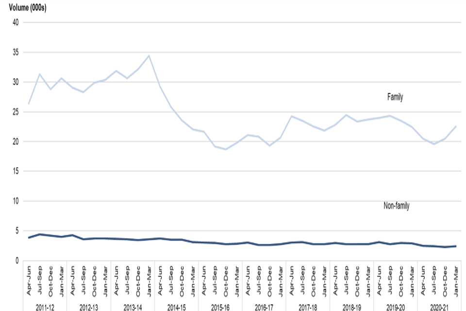 - Civil representation applications have fallen by 7% in April 2021 (9,200) compared to the monthly average between January and March 2021 (9,900 a month). Family applications decreased by 7% and non-family by 10% over the period.