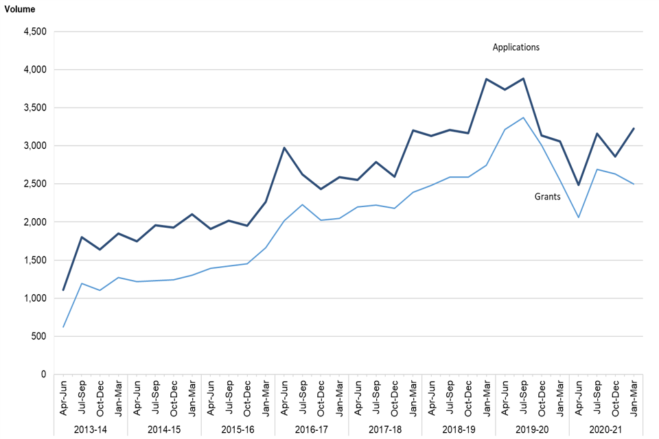 Figure 13: Volume of ECF applications received, April to June 2014 to January to March 2021