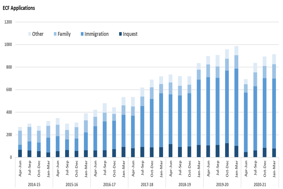 There were 913 applications (covered along with its current status, details and determination or outcome is provided in table 8.1) for ECF received from January to March 2021. This is a 7% decrease from the same quarter last year. 861 (94%) of these were new applications. Among the ECF applications received between January and March 2021, immigration (68%), inquest (9%), and family (14%) remained the most requested categories of law (Figure 13). A breakdown of ECF applications and grants by category of law is provided in table 8.2