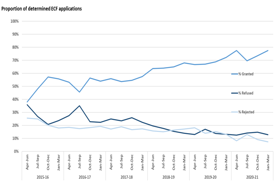 Figure 14: Proportion of ECF determinations by outcome, April to June 2015 to January to March 2021