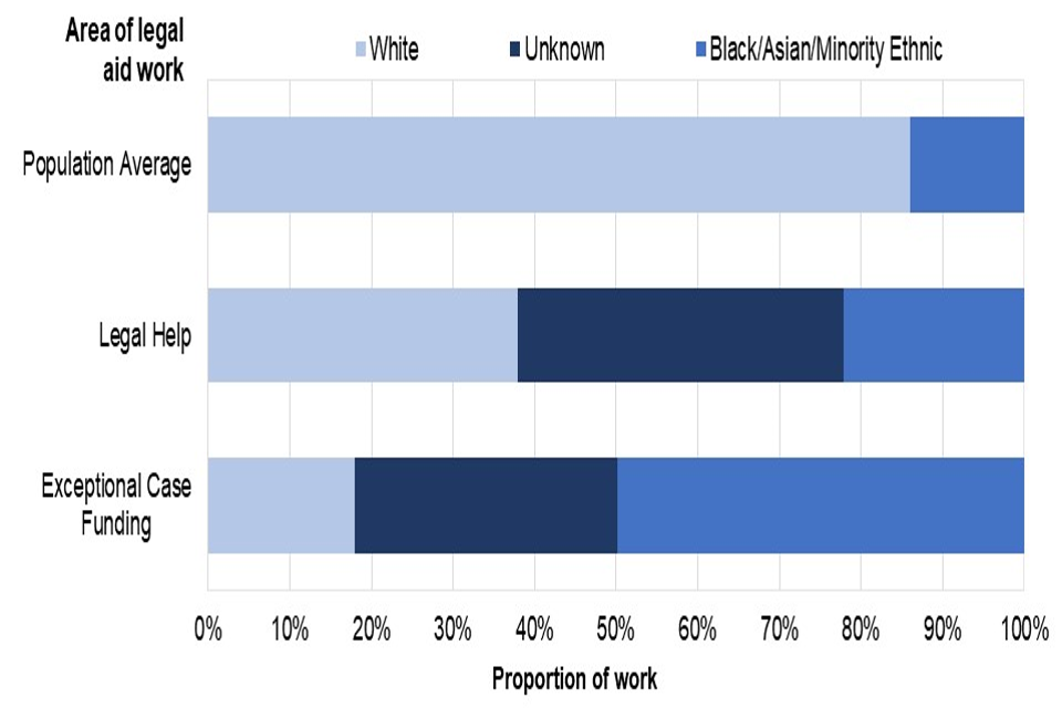 It is difficult to draw firm conclusions from some of the ethnicity data because of the high proportion for which ethnicity is unknown in most areas. Nevertheless, the proportion of legal help and ECF clients reporting as Black/Asian/Minority Ethnic (BAME) is much larger than in the general population. This may reflect the fact that controlled legal representation (CLR) for immigration is included within legal help and the majority of ECF grants are for immigration work.