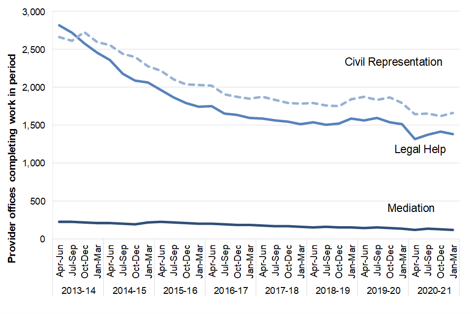 Over the last 5 years there has been a fall in the number of provider offices completing legal aid work.
