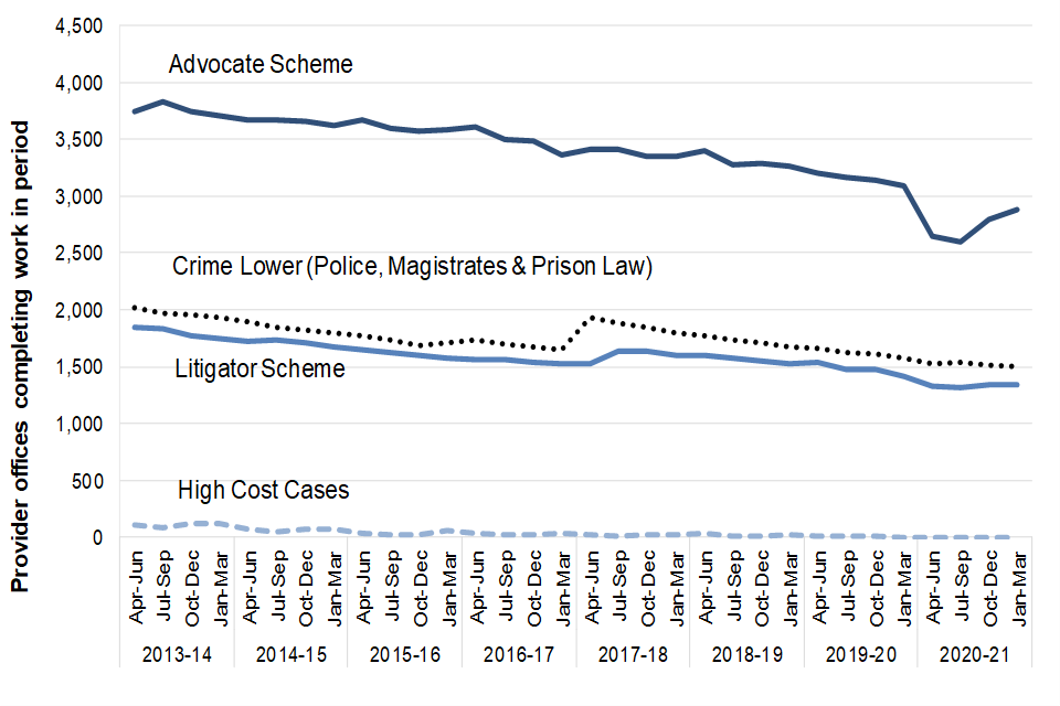 Across civil legal aid, the number of provider offices completing work has fallen by a fifth over the last 5 years and decreased by 8% in the last year. There was a more gradual downward trend for criminal work, although with the last year there is now a 20% fall in the number of provider offices over the last 5 years, and an 8% decrease over the last year.