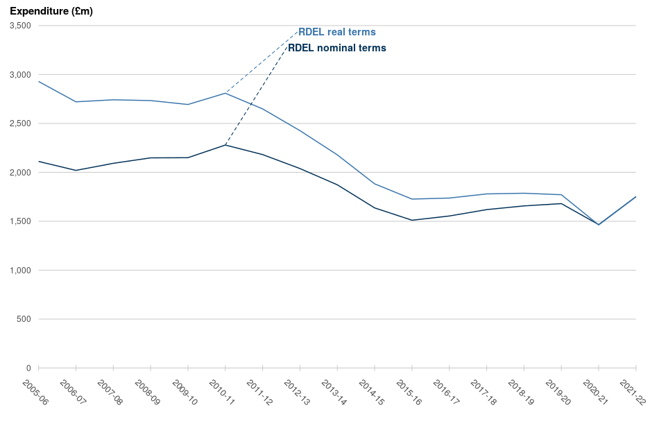 RDEL (Resource Departmental Expenditure Limits) nominal is the main budgeting measure used by government to control current spending, both to set budgets for future years and report on how much has been spent. It represents the value of work carried out in the period better than the closed-case measure but cannot be broken down to such a fine level of detail. This measure does incorporate income and expenditure in relation to debt. Nominal here means not adjusted for inflation.