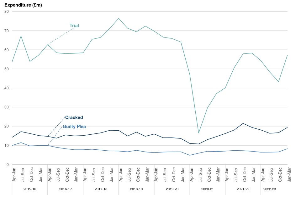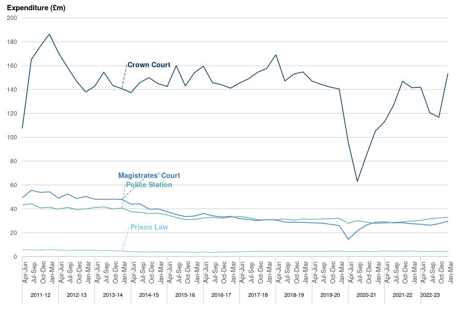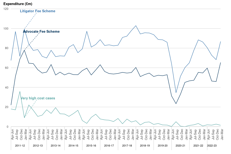 In the litigator fee scheme, expenditure increased by 1% in January to March 2023 compared to the same period of the previous year. In the advocate fee scheme, the value of payments increased by 19% compared to the same period of the previous year. Figures for expenditure on work completed in the Crown Court should be interpreted with caution as they may be revised in subsequent quarters as claims are assessed further on appeal and further payments added to the value of some completed claims.