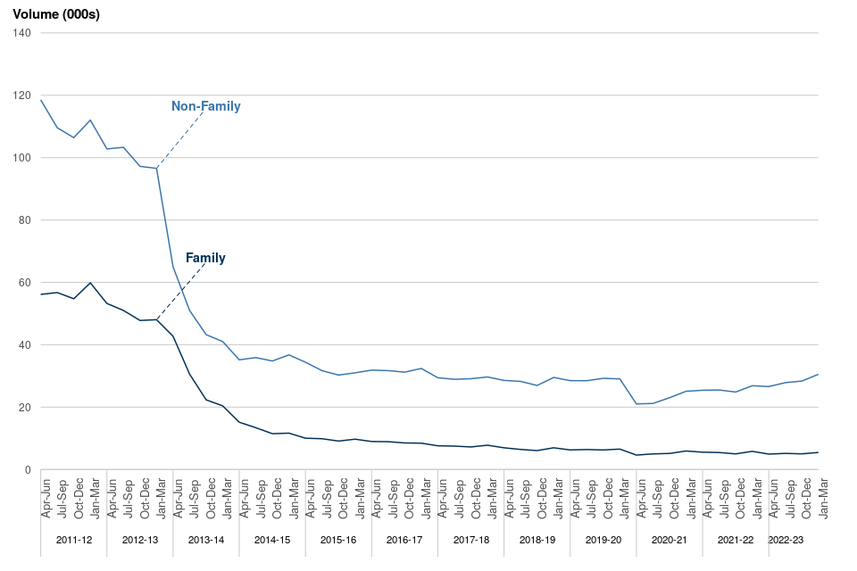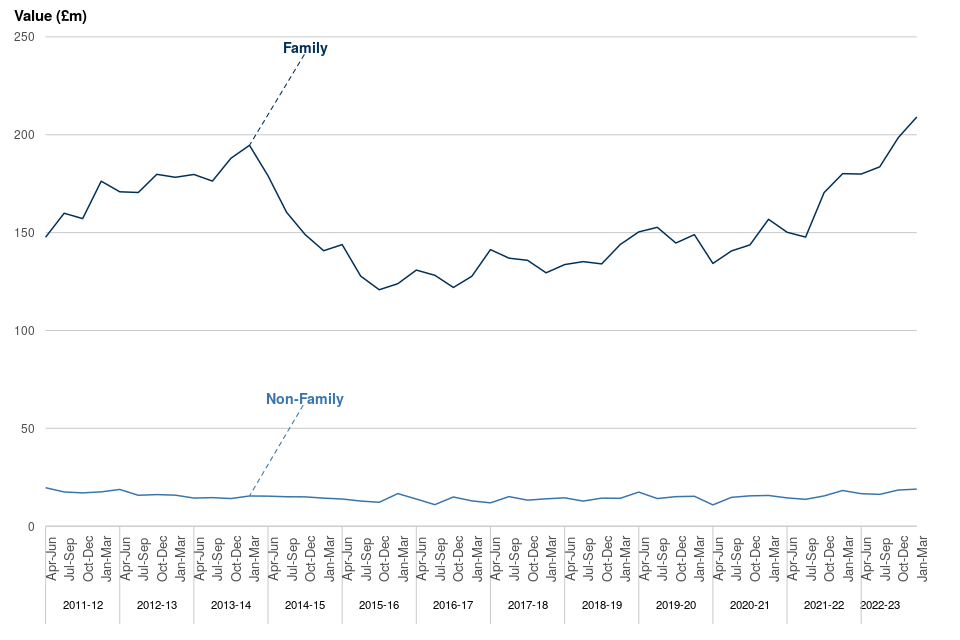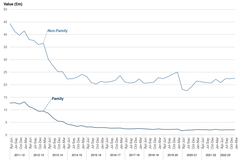 Civil legal aid can be categorised by area of law into family and non-family. The category of family legal aid covers all work on both private and public family law and includes work associated with the Children Act, domestic abuse, financial provision and family mediation. Non-family legal aid encompasses all work related to immigration, mental health, housing and other non-family law.
