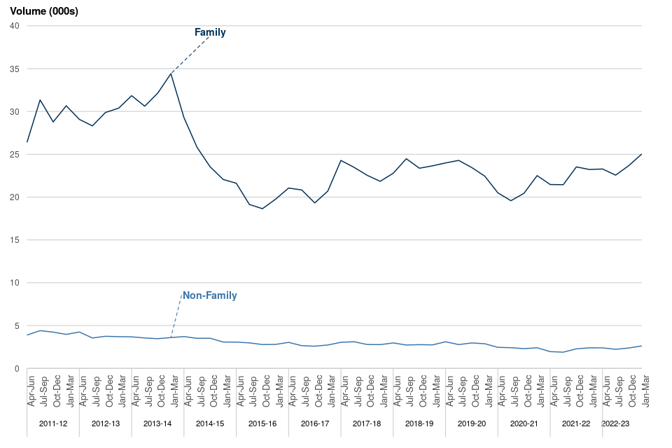 Civil legal aid volumes and expenditure show a varied picture compared to last year. Overall civil expenditure is returning to pre-pandemic levels driven by large increases in family law expenditure with the number of claims being paid outside of the fixed fee scheme increasing due to more time being taken during the court process. Other non-family workload has not recovered to the same extent, and this is driven by a slow recovery of housing work although in the last quarter this has increased. Overall civil legal aid workload still remains below pre-pandemic levels although trends are increasing in domestic violence, mental health and, within exceptional case funding and legal help, immigration.