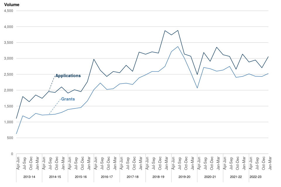 | Applications for civil representation supported by evidence of domestic violence or child abuse decreased by 2%. | ⬊ | The volume of these granted increased by 4% compared to the same period of 2022 and the proportion of these applications granted is roughly 80%. | ||
