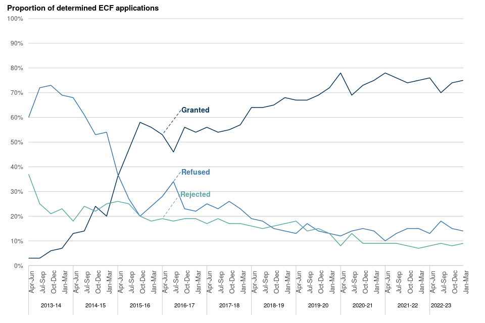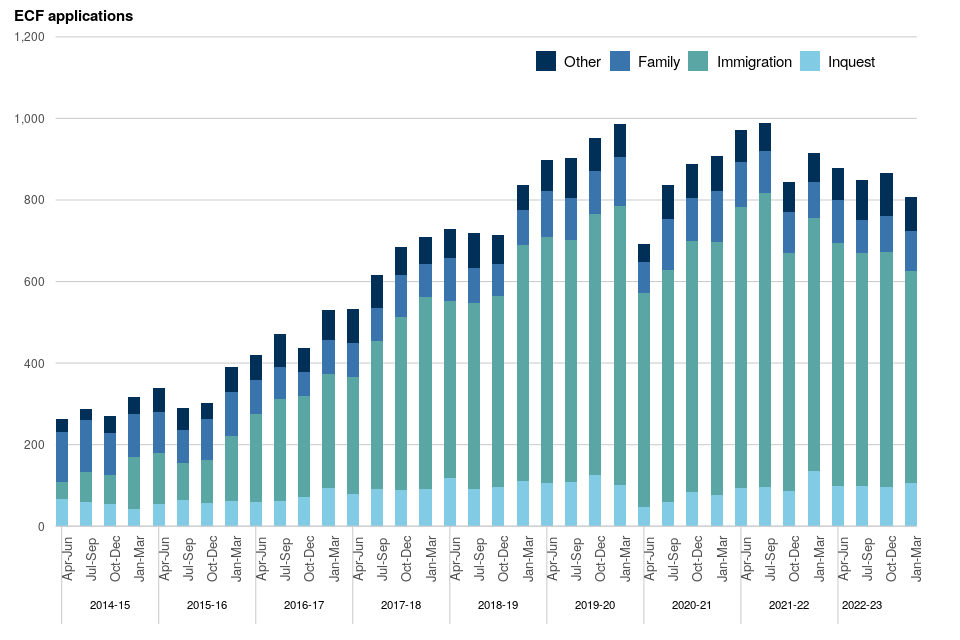 | There were 808 applications for Exceptional Case Funding received in the last quarter | ⬊ | This is a 12% decrease from the same quarter last year. | ||
