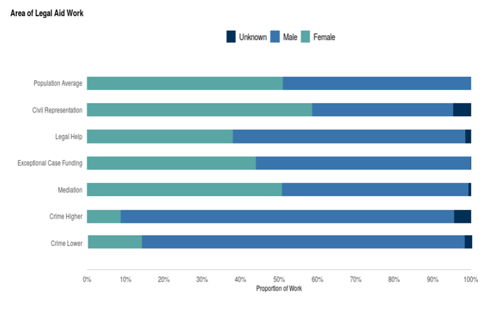 Generally, the age profile of legal aid clients is much less evenly spread than the population average, with a higher proportion of working age clients and a smaller proportion of over 55s. A much greater proportion of criminal legal aid clients are from young adult age groups (aged 25-34 and 35-44) than in the general population.