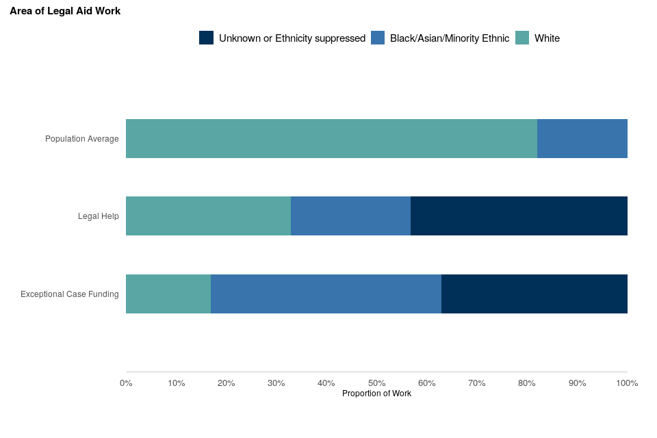 It is difficult to draw firm conclusions from some of the ethnicity data because of the high proportion for which ethnicity is unknown in most areas. Nevertheless, the proportion of legal help and ECF clients reporting as Black/Asian/Minority Ethnic is much larger than in the general population (Figure 15). This is likely to reflect the fact that controlled legal representation (CLR) for immigration is included within legal help and the majority of ECF grants are for immigration work.